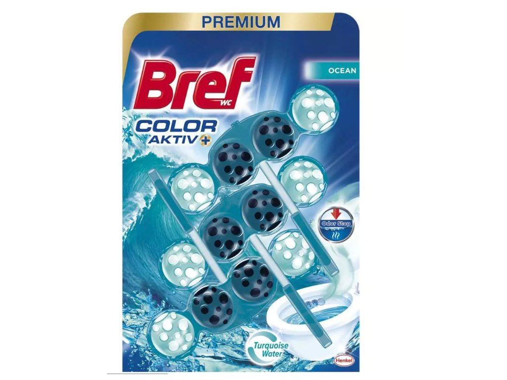 WC blok Bref Power Aktiv Premium Ocean 3 × 50 g poskytuje dlouhodobou svěžest a čistotu díky 4 účinkům: