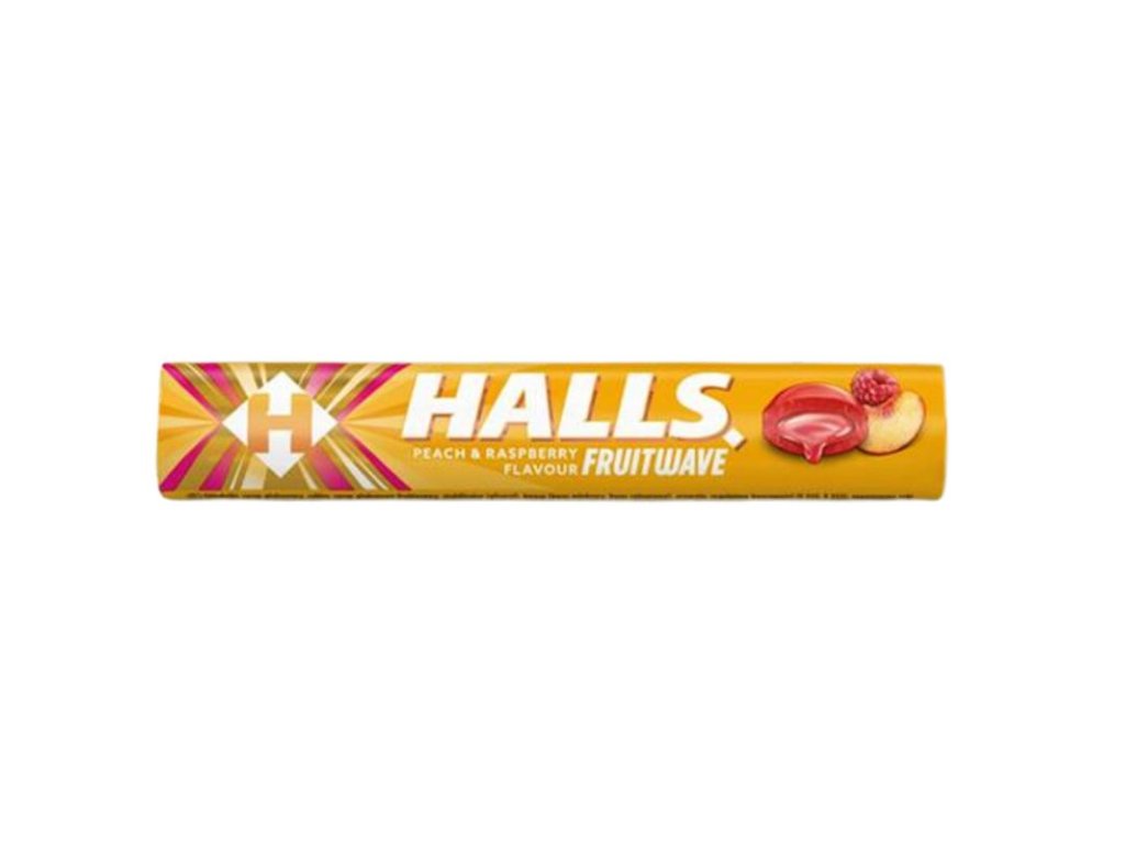 Halls Fruitwave 45g PeachRaspberry - Furé s tekutou náplní (17%) s broskvovou a malinovou příchutí. Nevhodné pro děti do 4 let.