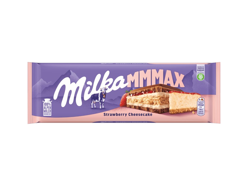 Čokoláda z alpského mléka plněná náplní (35 %) s příchutí cheesecake, jahodovou složkou (11 %) a sušenkou (13 %).